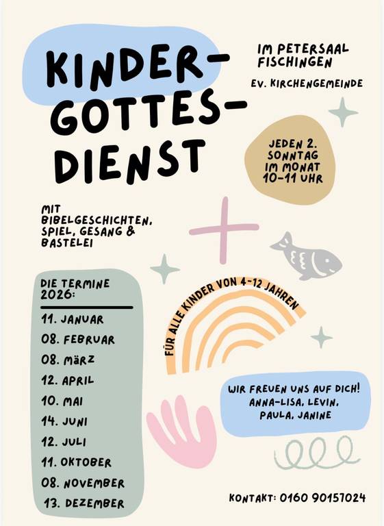 Der Kindergottesdienst findet im Petersaal in Fischingen an folgenden Sonntagen statt: